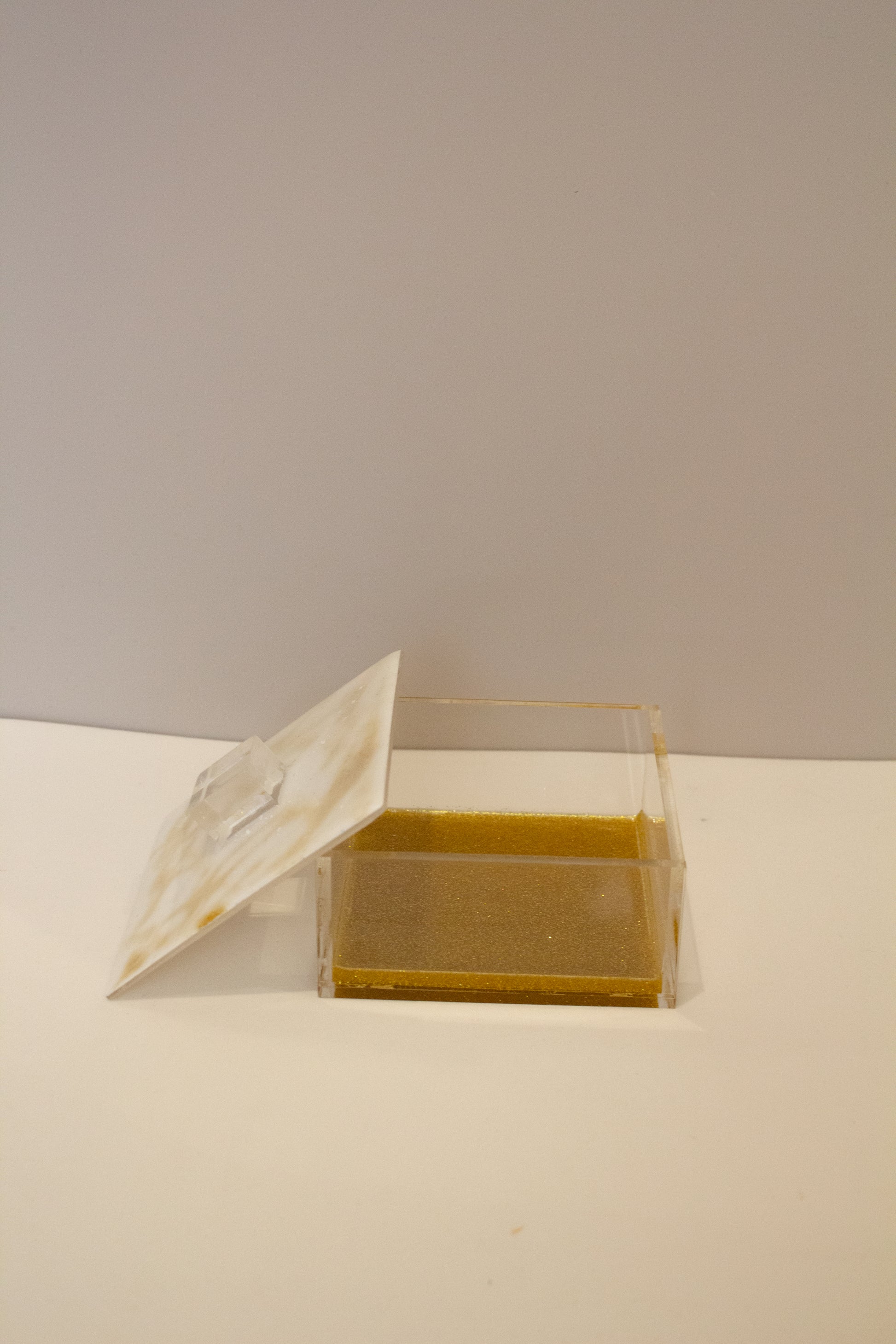 Alhajero cuadrado con tapa blanca con dorado y fondo dorado de glitter para poner tu joyería.