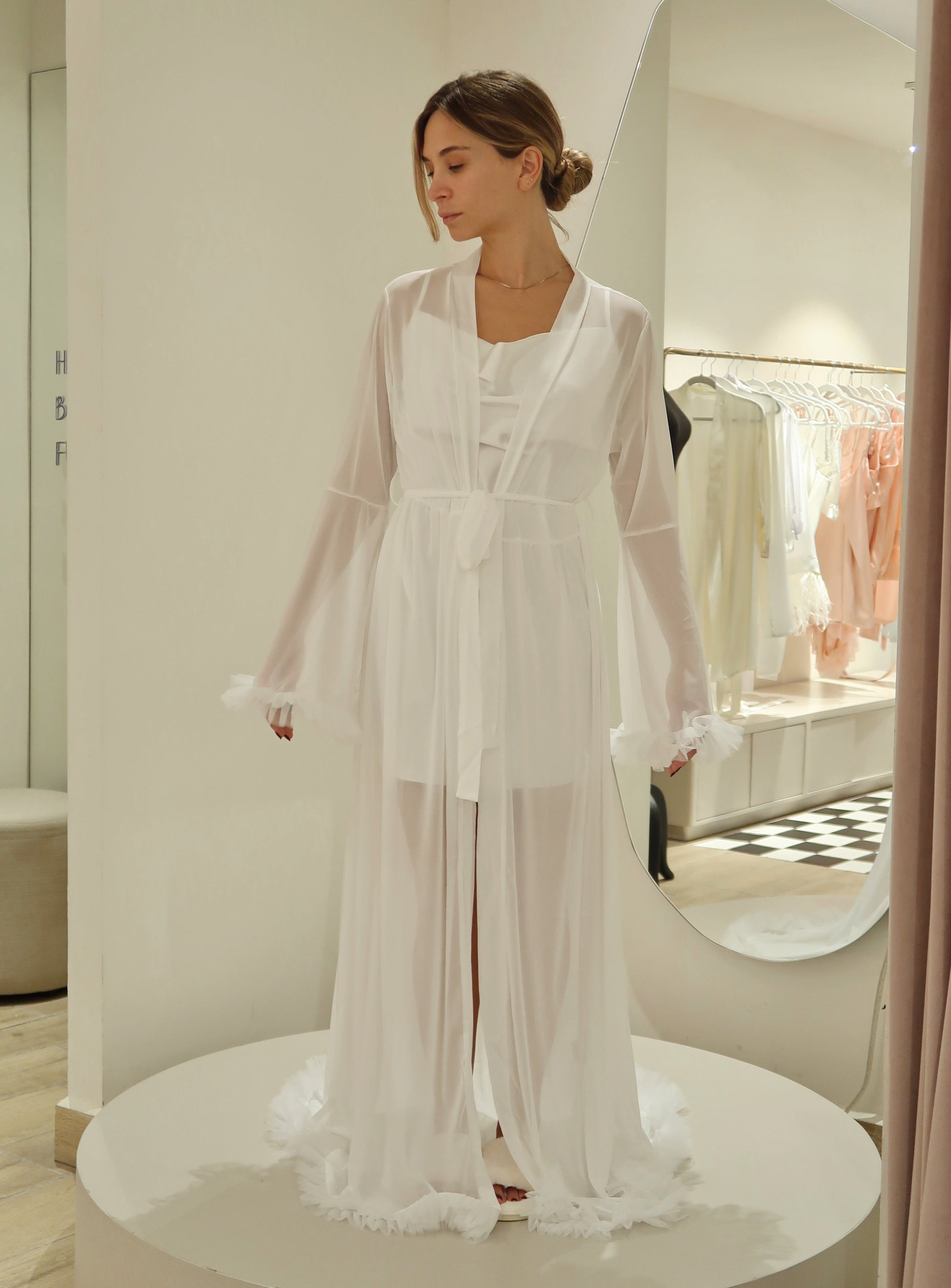 La Bata Larga de Tul con Manga de Olánes Blanca es una prenda elegante, fresca y cómoda, perfecta para utilizar en el getting ready del día de la boda💍.
