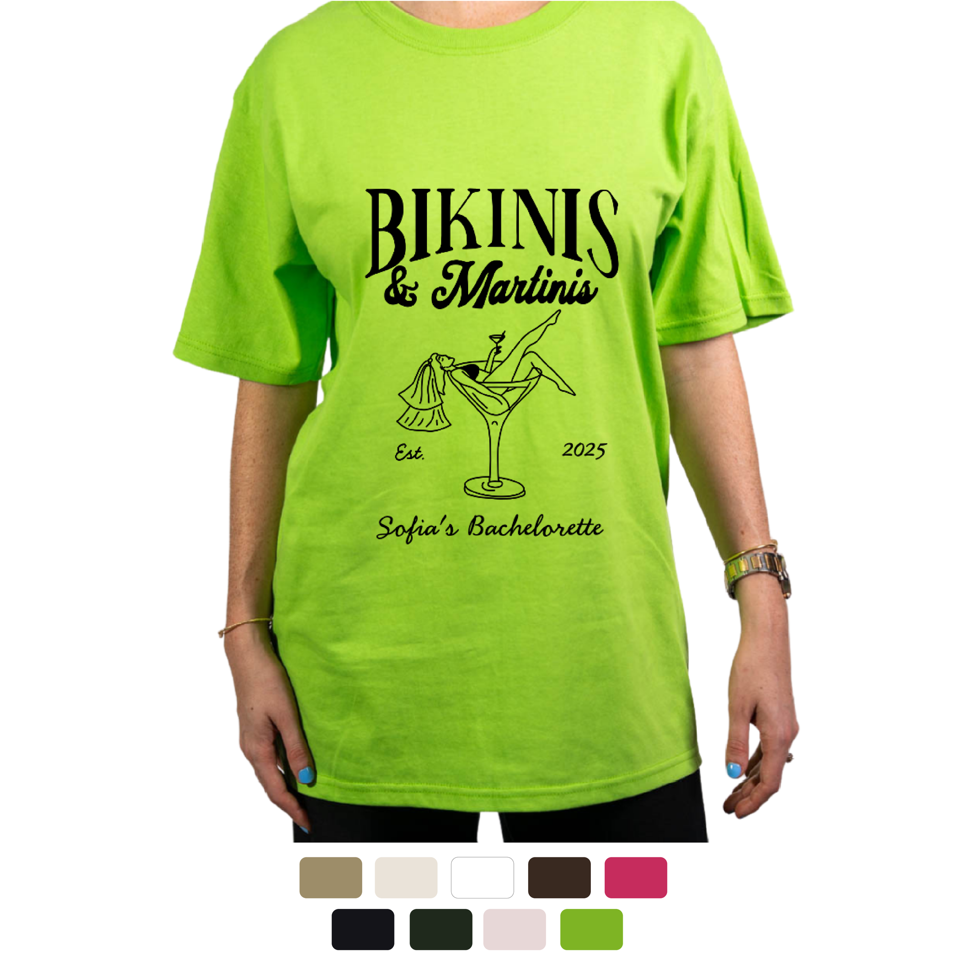 Haz que tu despedida de soltera sea inolvidable con esta camiseta oversize personalizada estilo "Bikinis & Martinis".