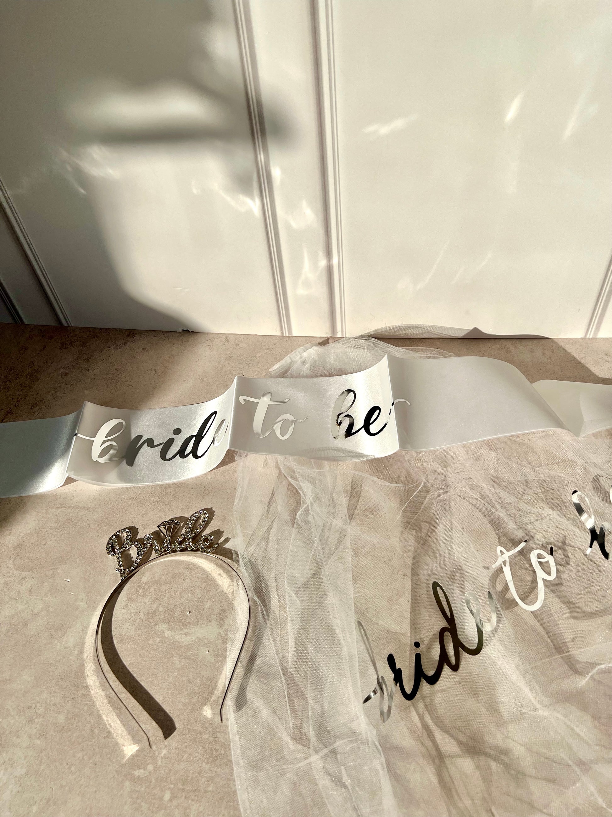 Este set incluye diadema, velo y sash con la frase Bride to Be, diseñados para hacerte brillar en cada foto y momento especial.